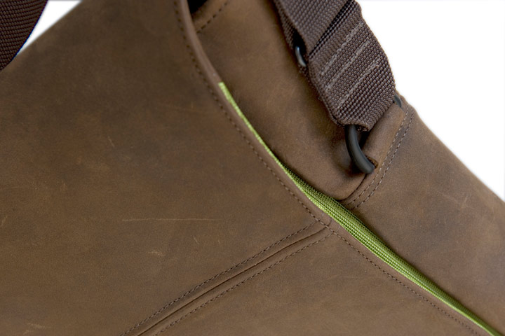Muzetto af Waterfield i brun læder med grønt stof closeup af siden Muzetto af Waterfield i brun læder med grønt stof closeup af siden