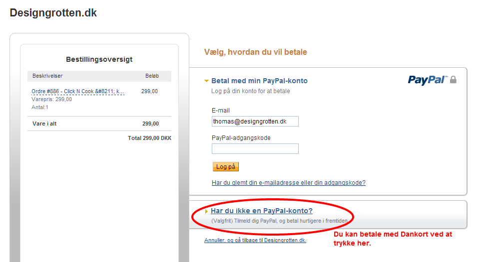 Kig på den røde ring, det er her du skal klikke, hvis ikke du har en PayPal konto.
